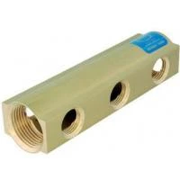Труба имеет отдельные выходы с внутренней резьбой G?", вход на распределитель - G1", отверстие в верхней части - место для автоматического воздуховыпускного клапана. Выходы к отдельным контурам размещены с шагом 50 мм.