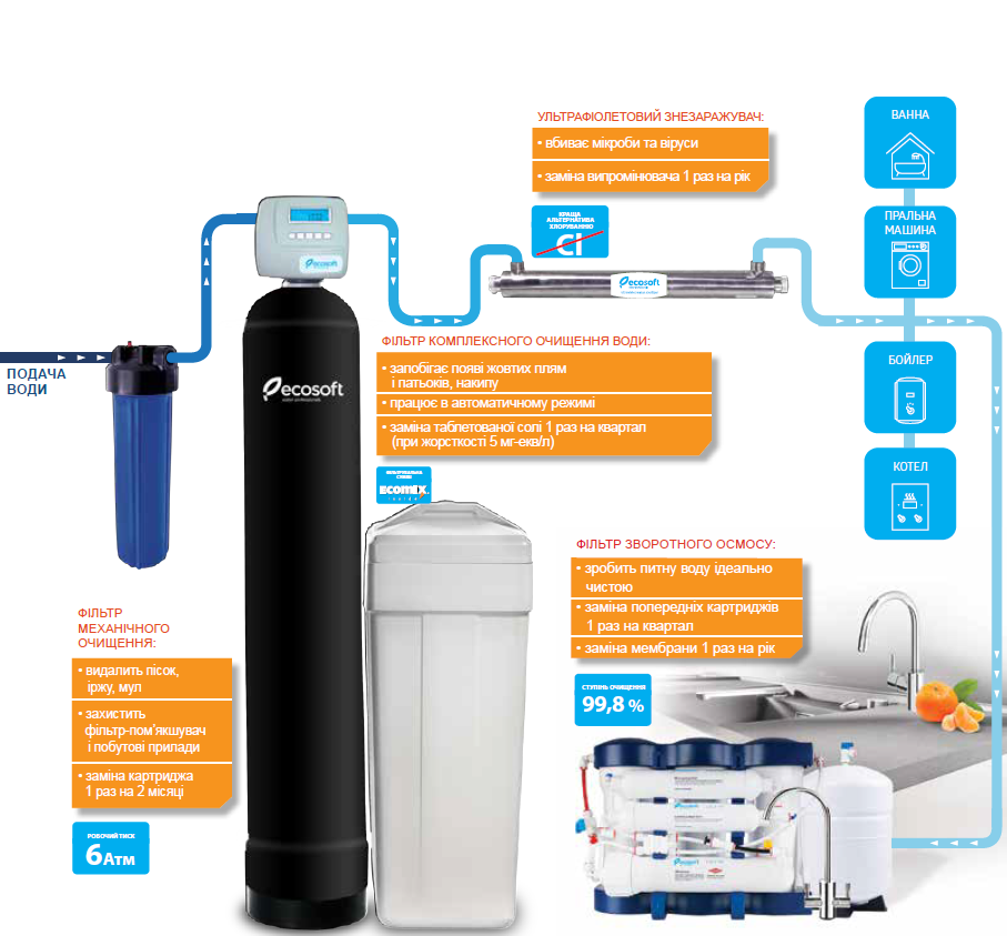 Фильтр комплексной очистки позволяет существенно сэкономить на приобретении и обслуживании системы домашней водоподготовки. Один фильтр Ecosoft FK 1252 CE заменяет несколько специализированных установок. Система работает автоматически, а её обслуживание сводится лишь к своевременному добавлению таблетированной соли.