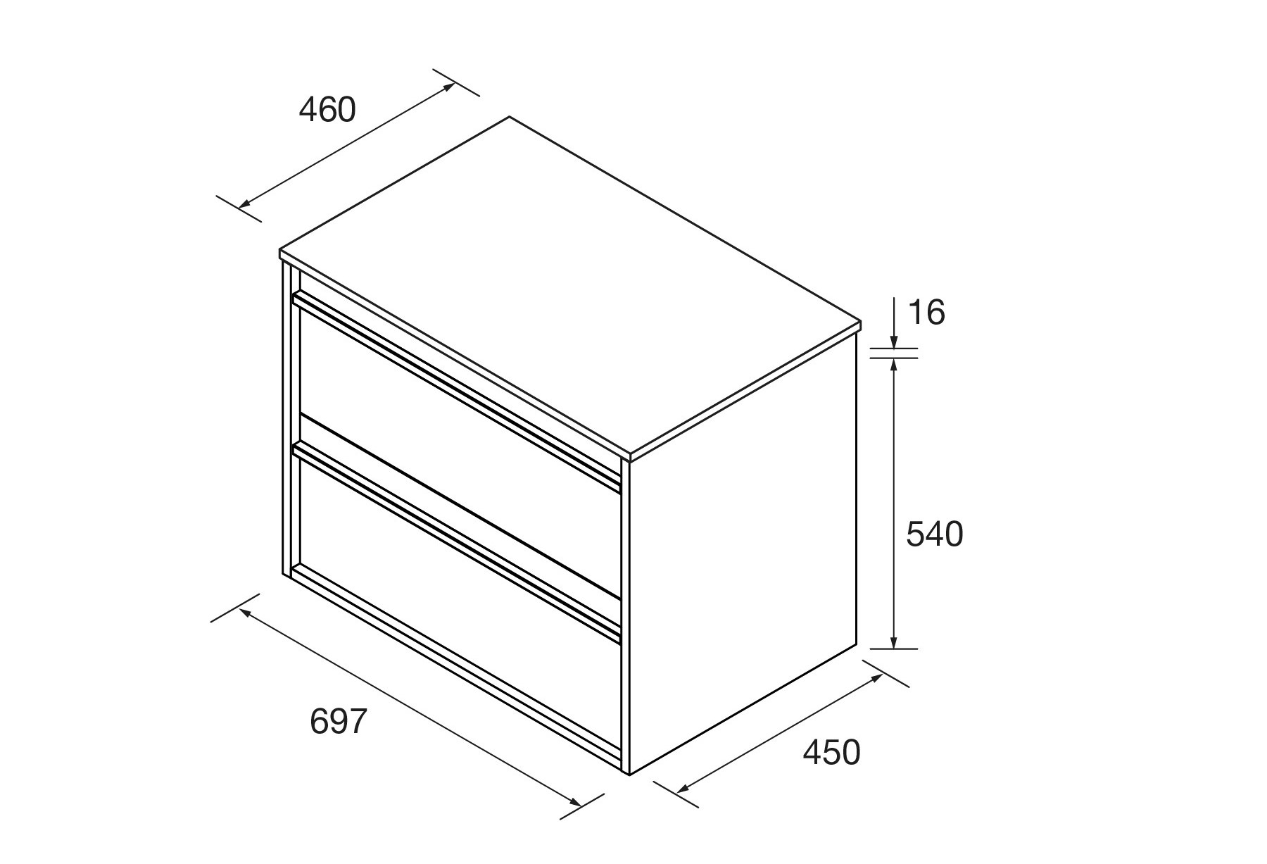 В комплект входит шкаф для ванной комнаты с двумя ящиками и механизмом плавного закрывания, органайзер для ящиков и направляющие с функцией плавного закрывания.