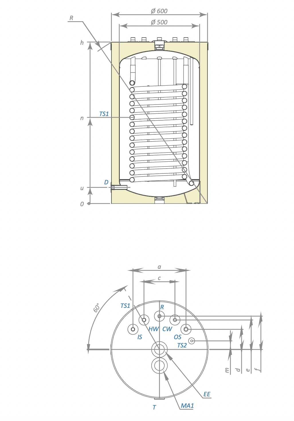 Бойлер косвенного нагрева 150л, 1 змеевик 1,52м2, выходы вверх, монтаж под котлом