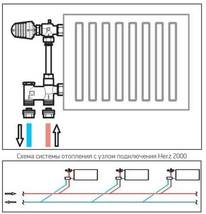 Радіаторний гарнітур Herz-2000-TS-90 застосовується при боковому підключенні радіаторів при нижньому підведенню трубопроводів.